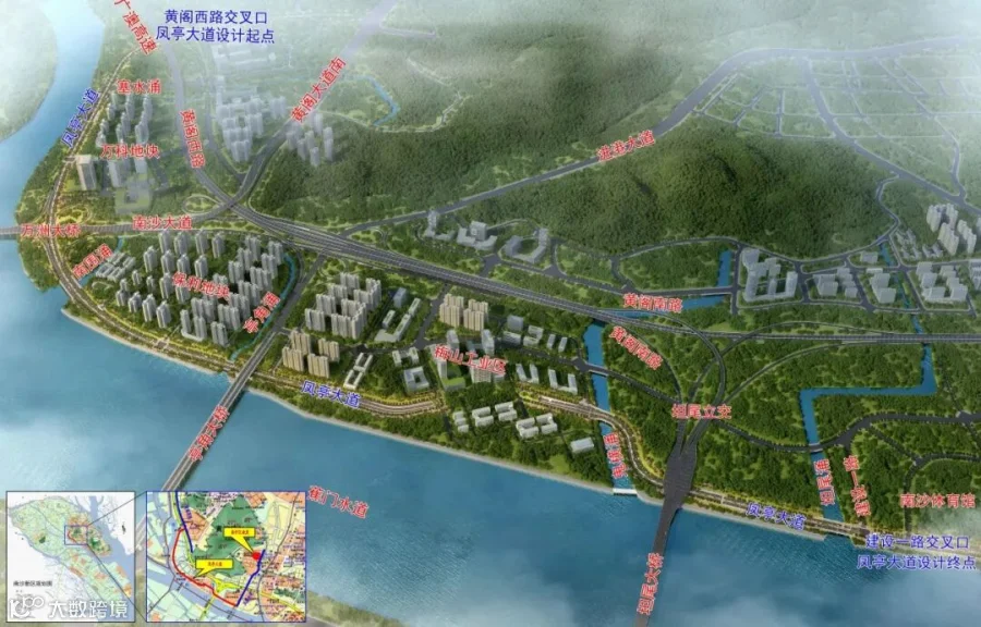 凤亭大道项目为新建市政道路,总长5.08千米,线路起于南沙区黄阁西路与南涌口路平交口,终至南沙体育馆附近,红线宽度40m至43m,双向6车道,道路等级为景观性城市主干路,施工内容包括隧道、桥梁、道路及配套排水、管综、交通、照明等工程。