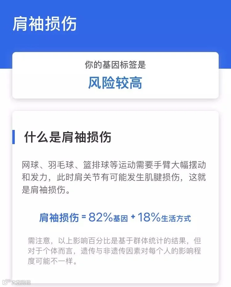 比如基因检测显示,你的「肩袖损伤风险较高」,但是「跟腱损伤风险正常」。那么就可以建议教练: