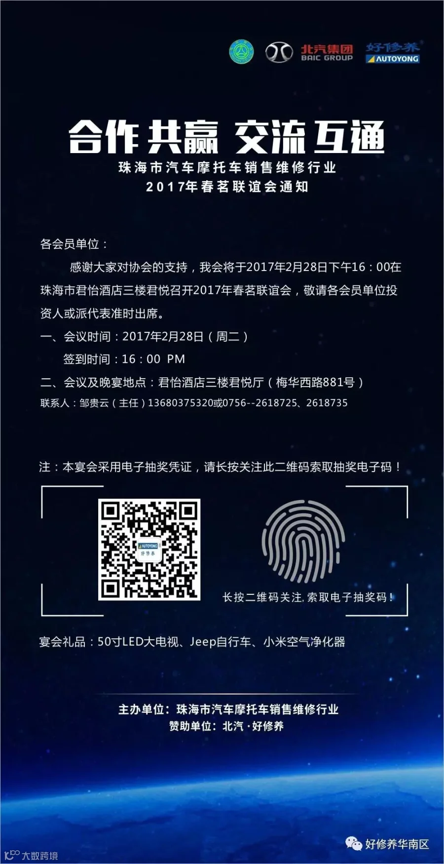 导读:我会将于2017年2月28日下午16:00在珠海市君怡酒店三楼君悦召开2017年春茗联谊会,敬请各会员单位投资人或派代表准时出席。
