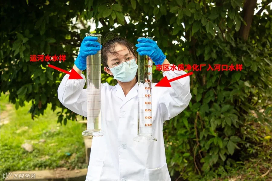 为了消除市民的疑虑,我们在市区水质净化厂(即市区污水处理厂)的出水口进行了取水检测,分别在污水处理厂出水口的“黑水”处和河水处采集了样本,神奇的事情发生了,在量筒中,河水比“黑水”更浑浊,反而在河道里看起来黑如墨汁的“黑水”竟然接近透明。