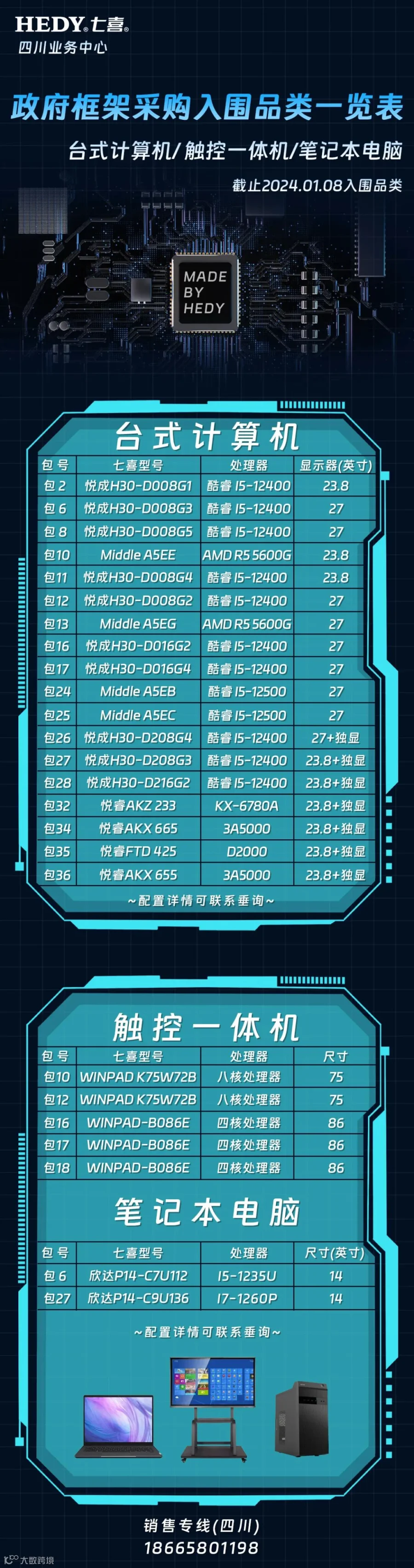 近日,七喜的产品成功入围了四川省政府的框架采购,这标志着七喜在政采行业中的实力得到了进一步的认可。此次框架采购,涵盖了悦成H30系列台式机、P14笔记本电脑以及悦睿触控一体机等产品,充分展现了七喜产品的多样性。