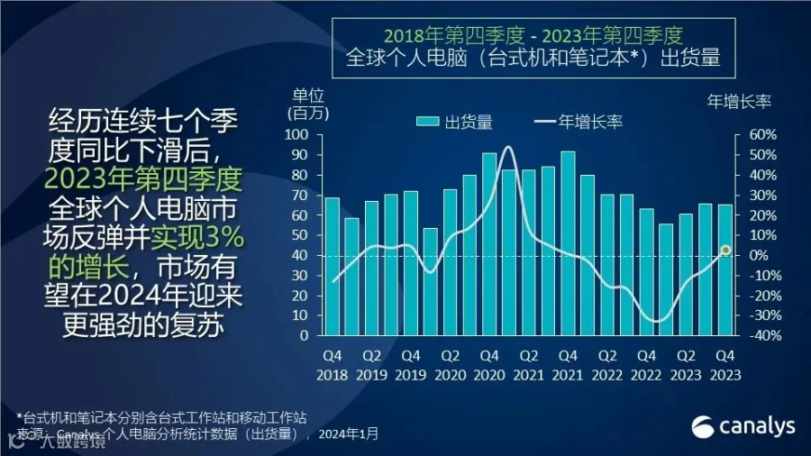 2023年第四季度,全球个人电脑(PC)市场终于迎来了久违的同比增长。据分析机构 Canalys 的报告,这一季度全球 PC 市场出货量达到了 6530 万台,同比增长 3%,打破了连续七个季度的下滑趋势。这一积极的变化标志着个人电脑市场开始逐渐复苏,为行业带来了新的希望和机遇。