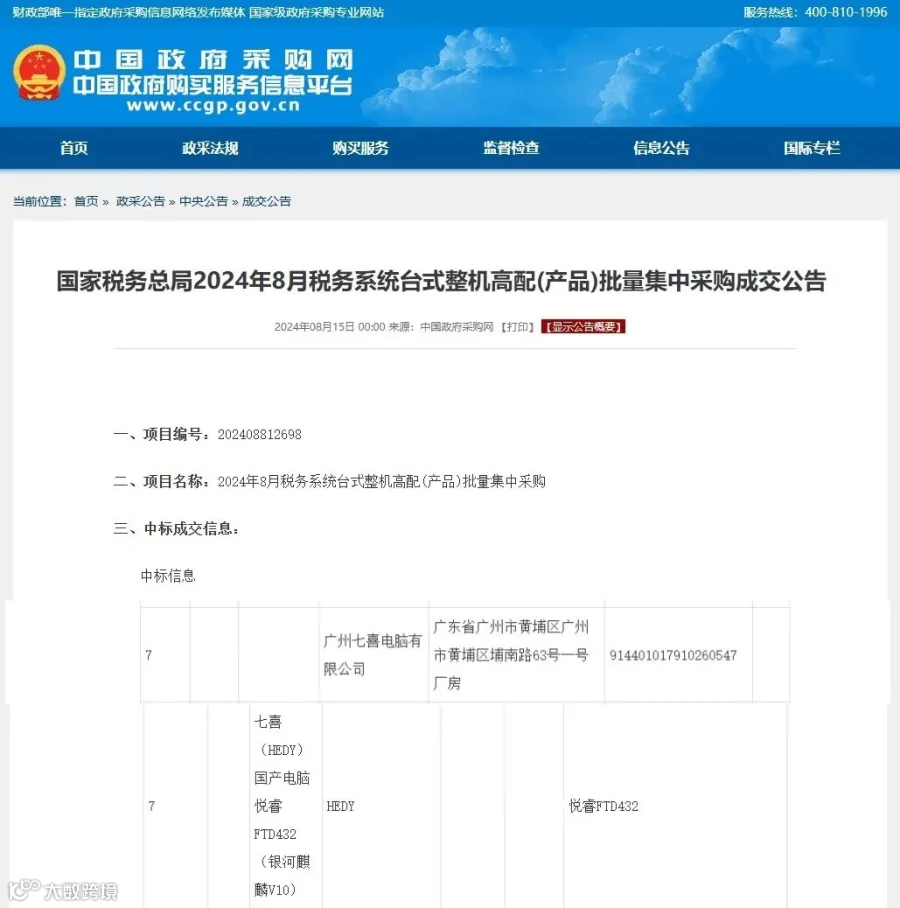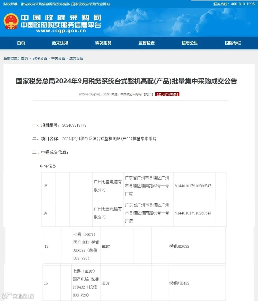 近日,七喜电脑在政府采购领域取得了又一重大突破,在国家税务总局2024年8月和9月税务系统台式整机高配批量集中采购项目中成功中标,在此次采购项目中,七喜电脑凭借其丰富的产品线、卓越的性能表现和稳定的品质,赢得了国家税务总局的高度认可,充分展示了七喜电脑在全国范围内的广泛认可度。