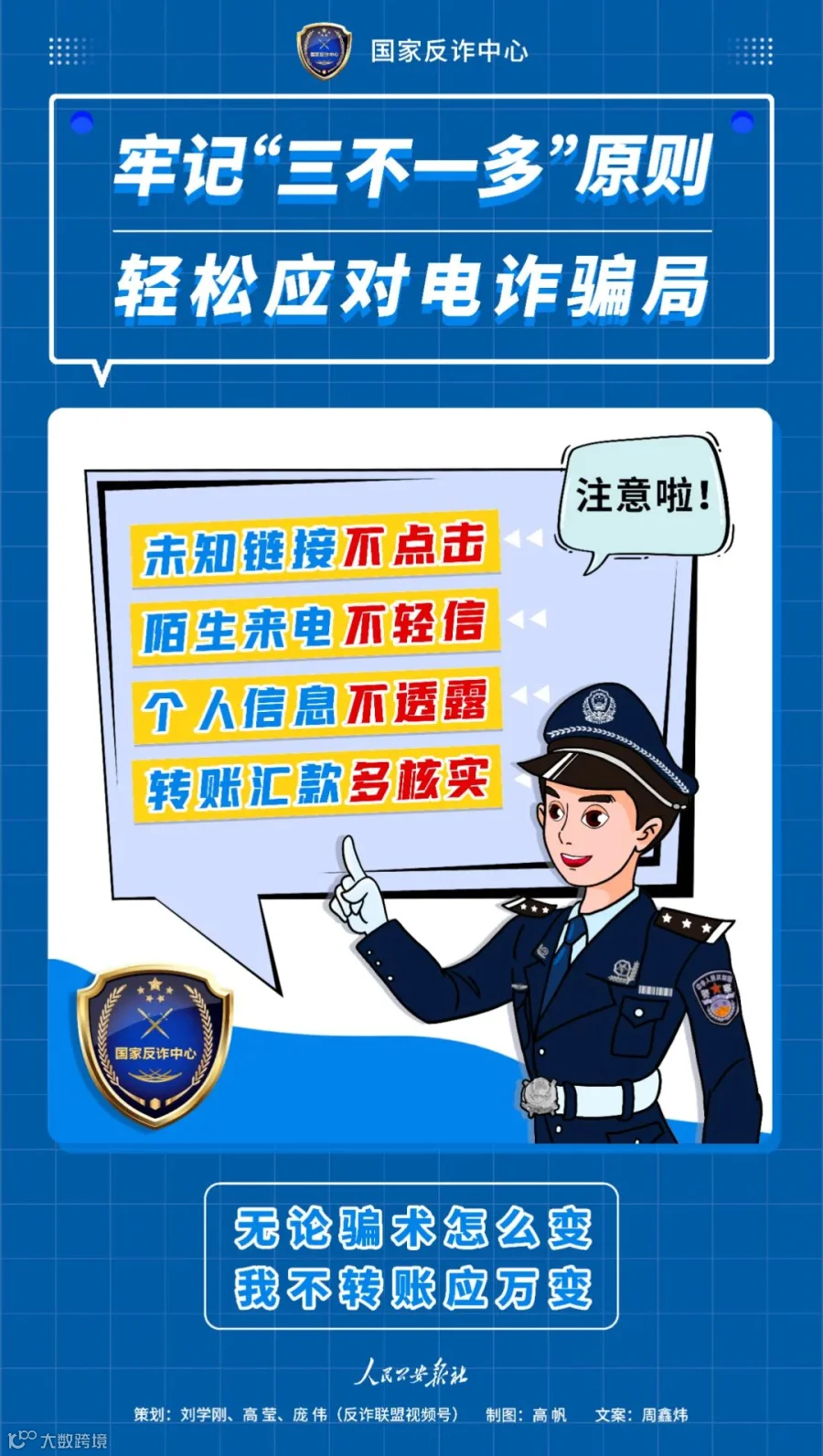 相信大家经过浏览以上的案例,对高发的电信诈骗方式已经有了一定的认识,但是电信诈骗的套路变幻莫测,我们还是需要牢记“三不一多”原则,提高我们的防范意识,守护我们的钱袋子。