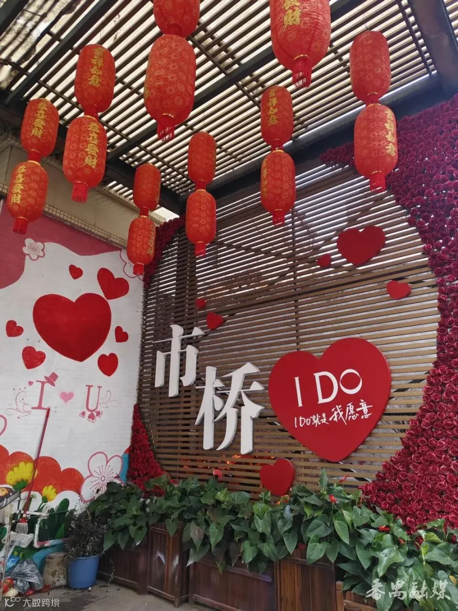 除了头顶的“一抹红”,东涌路的墙面多幅以“浪漫”为主题的墙绘作品沿街铺展,成为市民驻足拍照的焦点。“我在市桥,很想见你一面”的温情告白墙、“I LOVE U”的浪漫表达、“I DO 就是我愿意”的玫瑰花墙……一面面原本斑驳的旧墙,经艺术彩绘装点,焕发出时尚活力。不少年轻市民专程前来打卡,在墙绘前合影留念。