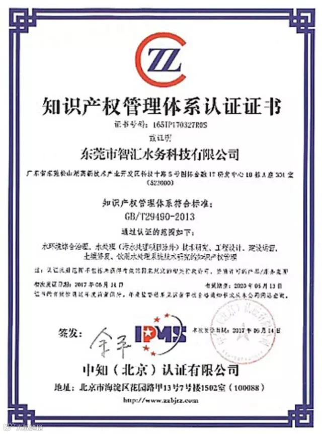 近日,水投集团下属东莞市智汇水务科技有限公司获得《知识产权管理体系认证证书》,正式通过知识产权管理标准化认证(知识产权贯标)。
