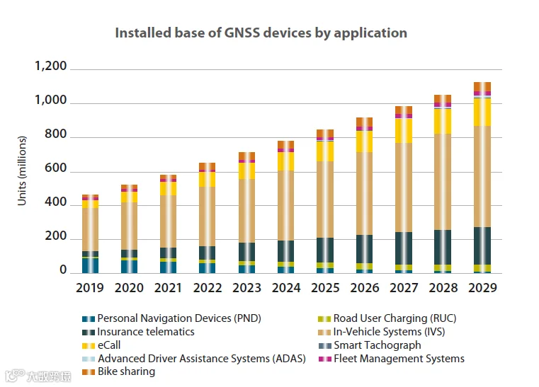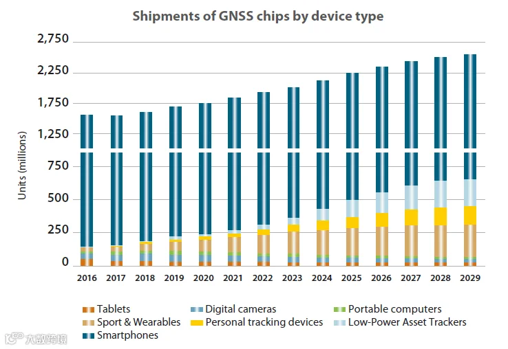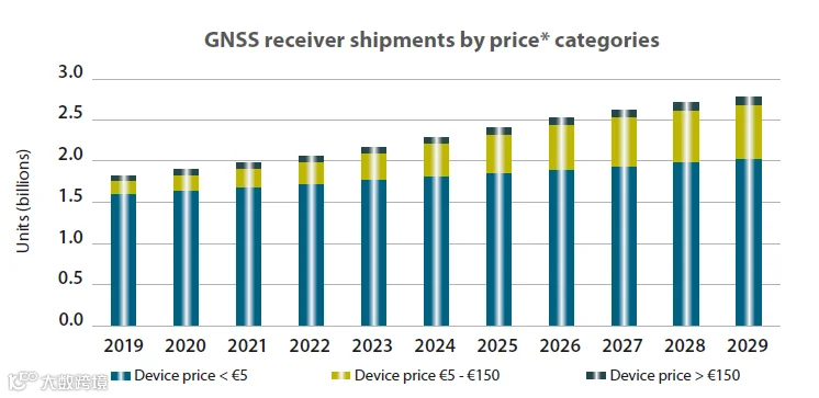 GNSS接收机出货量将从2019年的18亿台增长到2029年的28亿台,其中:
