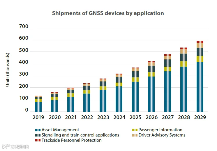 物资管理和乘客信息方面的应用设备占了铁路GNSS应用的三分之二。