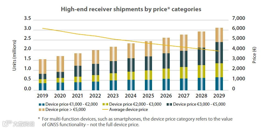 随着专业GNSS市场逐渐成熟和亚洲厂家不断增强的竞争力,1000欧元以上的专业高端GNSS接收机的平均价格会从2019年的6000欧元下降到2029年的4000欧元。