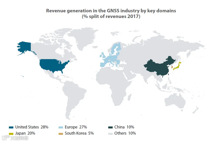 GNSS行业收入主要来源于美国(28%),欧洲(27%),中日韩(35%)三个区域。