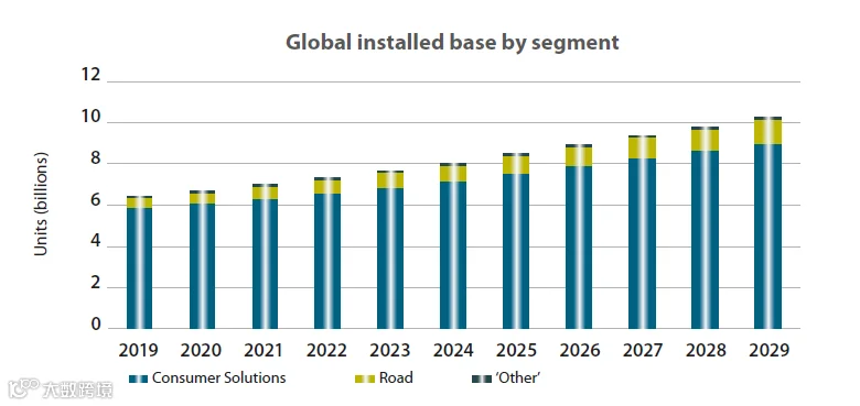 低于5欧元的设备占比最大,2019将有16亿台,而到2029年将增至20亿台,这其中90%用于智能手机和可穿戴设备。