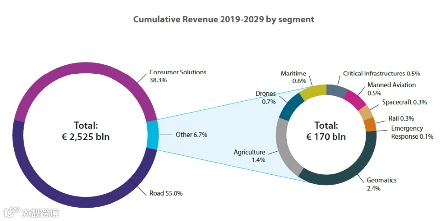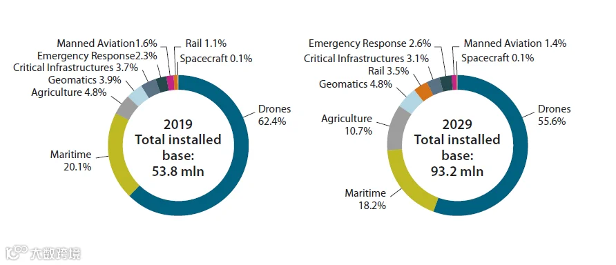 按细分市场统计,未来10年车载和消费类的细分市场加起来占据了总市场份额的93.3%。而精准农业和地信行业则占据了余下份额的50%以上。