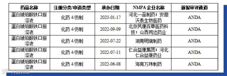 ▲表2 蛋白琥珀酸铁口服溶液新4类仿制申报情况