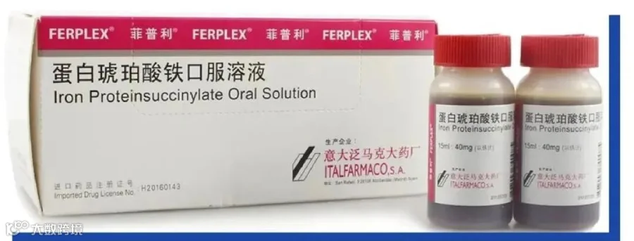 蛋白琥珀酸铁(Iron Proteinsuccinylate)最早由意大利 Italfarmaco S.A.研制开发,并于 1987 年上市。蛋白琥珀酸铁口服溶液原研已进入中国市场,商品名为菲普利(Ferplex),适用于绝对和相对缺铁性贫血的治疗,由于铁摄入量不足或吸收障碍、急性或慢性失血以及各种年龄患者的感染所引起的隐性或显性缺铁性贫血的治疗,妊娠与哺乳期贫血的治疗。截至目前该剂型已在全球 20 多个国家上市。
