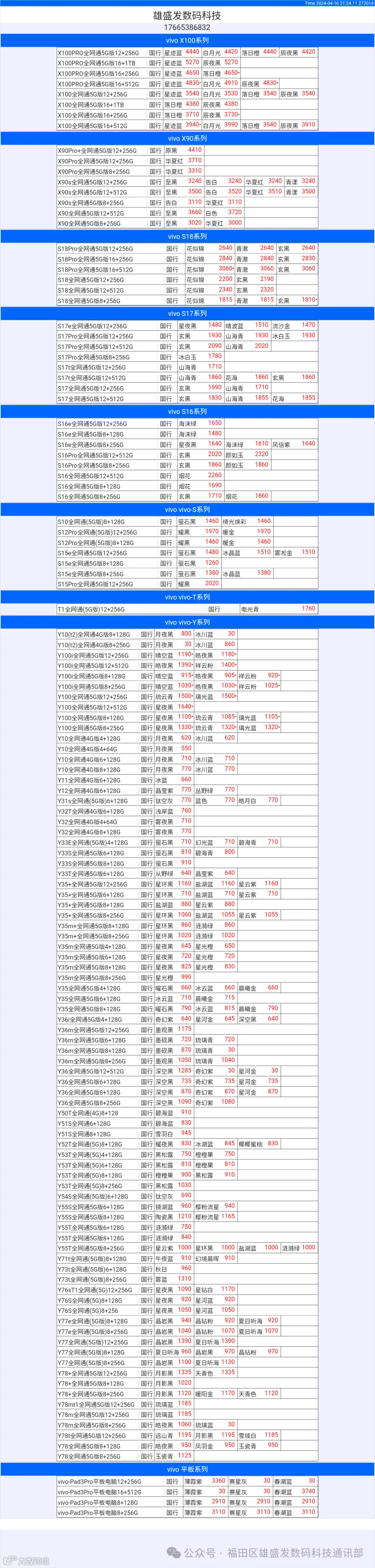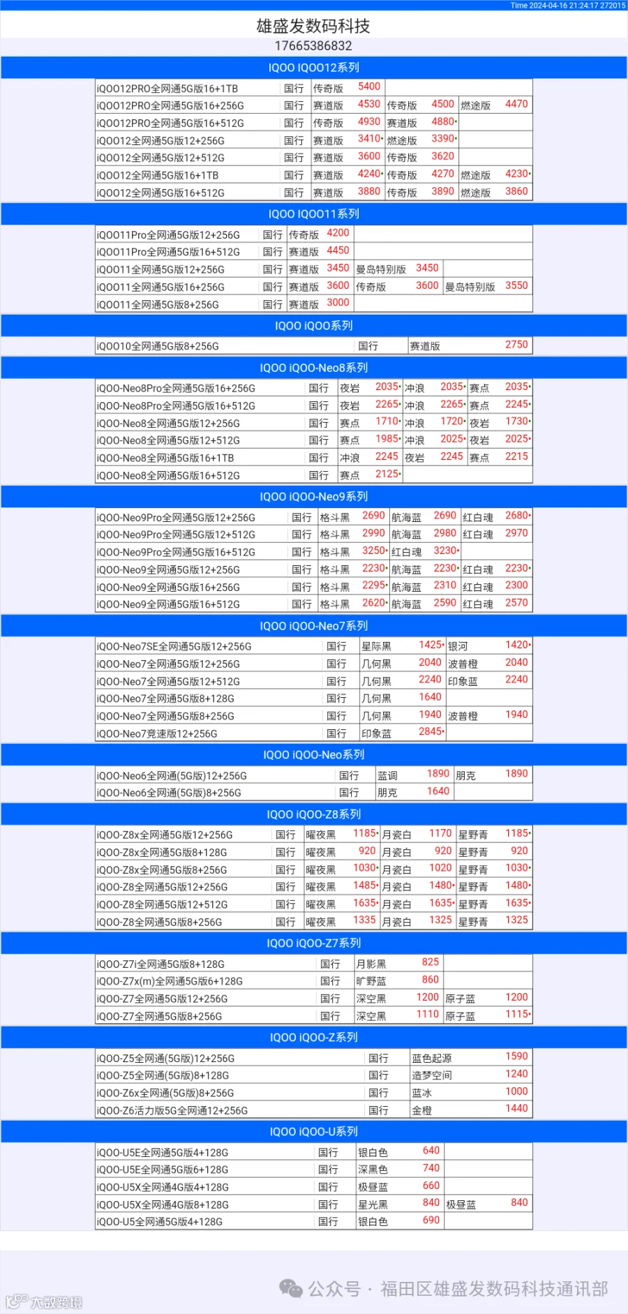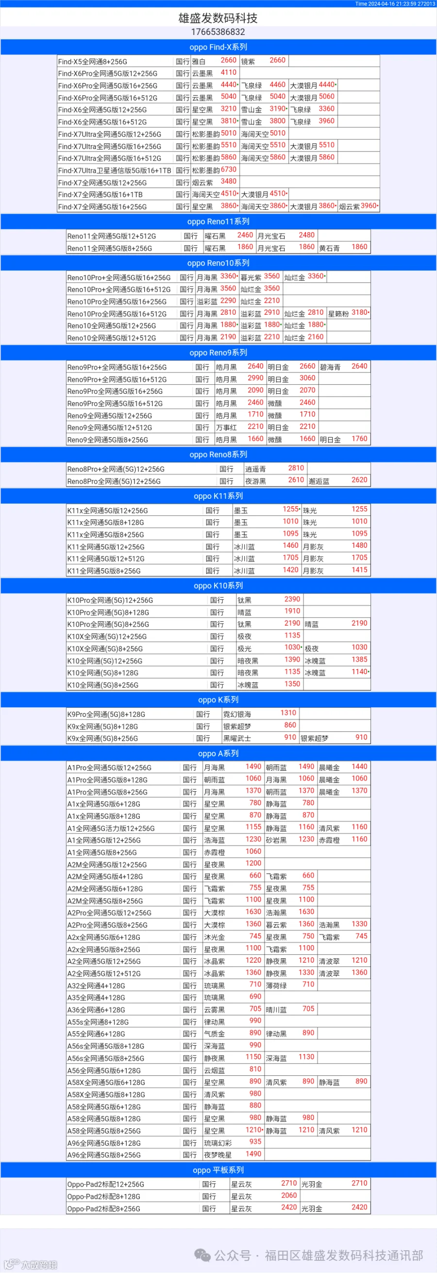 新机报价【2024年4月16日】OPPO   VIVO  IQOO   一加   真我 芯烨微 电子科技