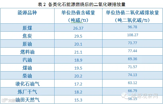 在各类能源中,我们比较关注的是原煤、汽油、柴油和天然气这四种化石能源的碳排放水平。从表1可以看出,从单位热值能源的含碳量来看,原煤(26.37)>柴油(20.2)>汽油(18.9)>天然气(15.3),这些数字的单位都是吨碳/TJ。1个TJ≈3.07吨标准油≈4.39吨标准煤。也就是说,在同等热值条件下,原煤、柴油、汽油、天然气的含碳量的相对关系是1.72:1.32:1.24:1.00,原煤的碳含量水平是天然气的1.72倍,柴油是天然气的1.32倍,汽油是天然气的1.24倍。