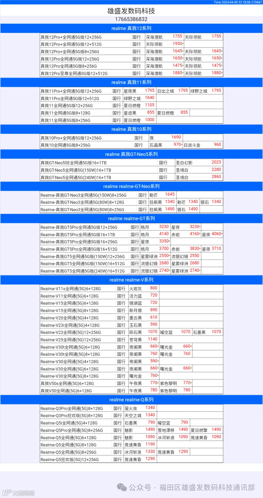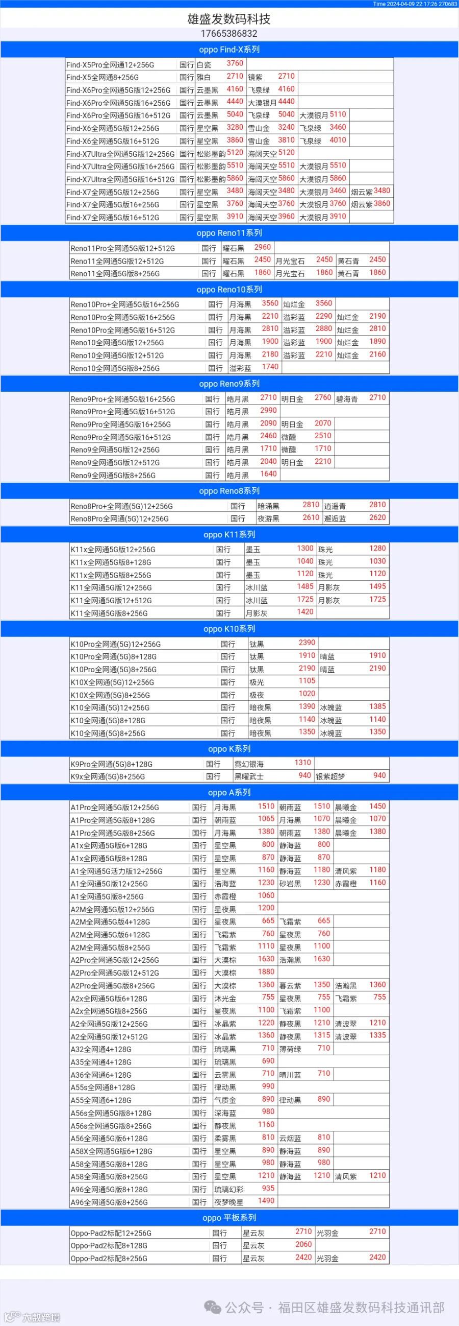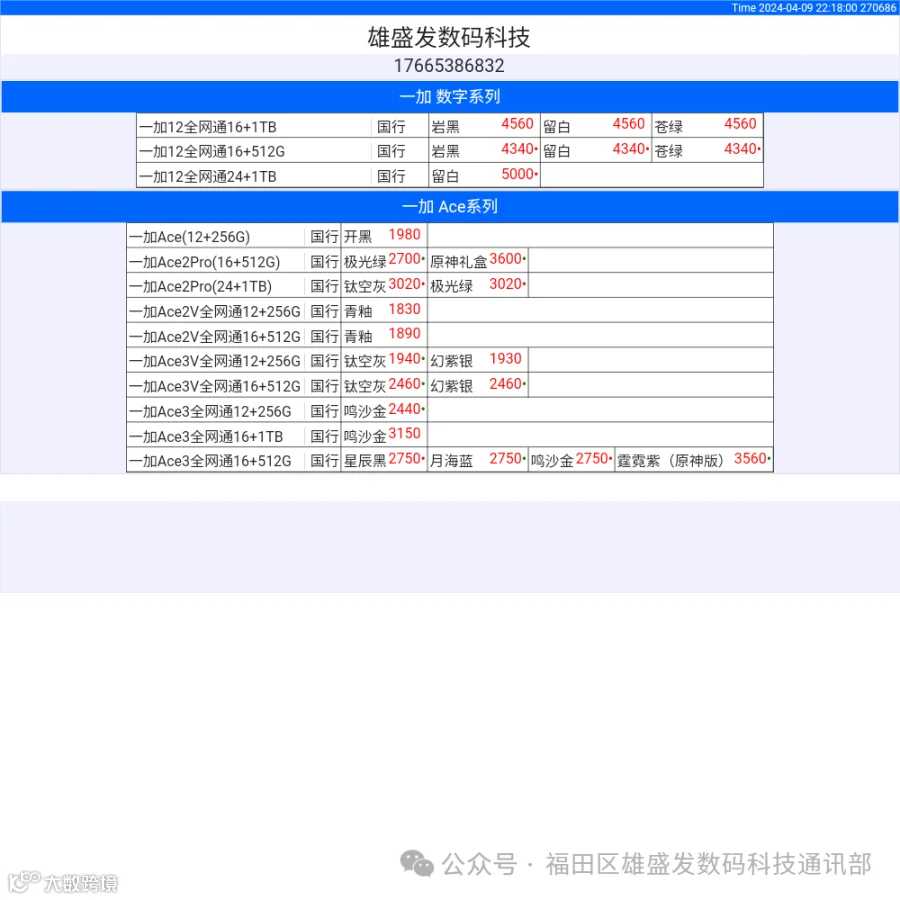 新机报价【2024年4月9日】OPPO   VIVO  IQOO   一加   真我 芯烨微 电子科技
