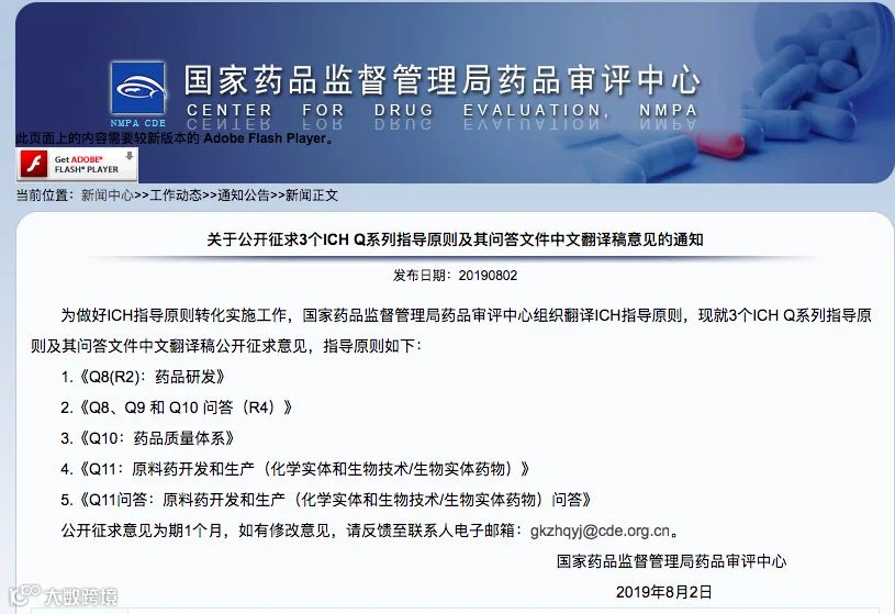 2019年8月2日,国家药品监督管理局药品审评中心发布关于公开征求3个ICH Q系列指导原则及其问答文件中文翻译稿意见的通知。