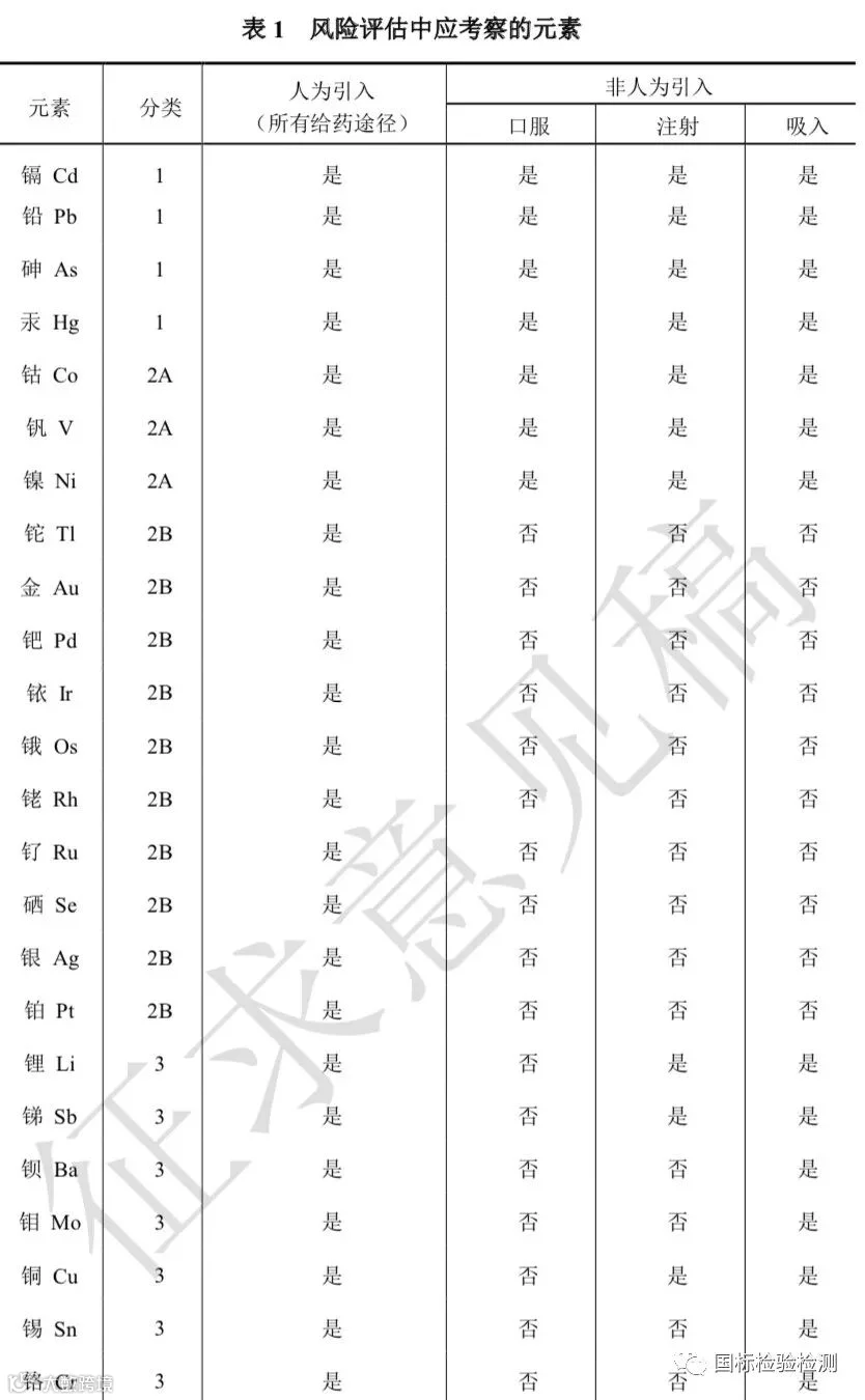 根据药品中元素杂质分类及其毒性、是否人为引入以及给药途径,风险评估中应考虑的元素杂质见表 1。