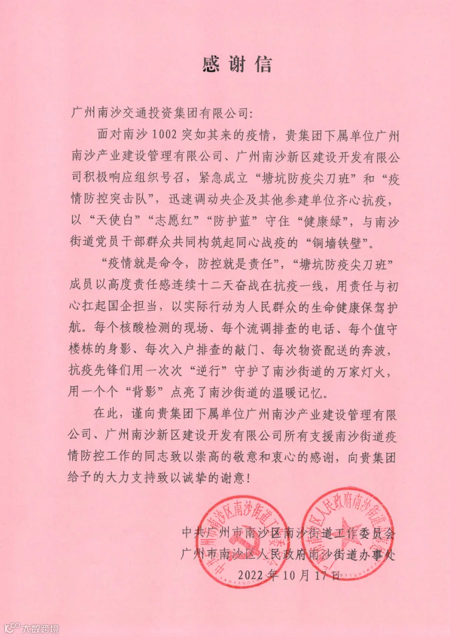 近日,集团公司收到了南沙街道党工委、南沙街道办发来的感谢信,信中特此感谢产业(新区)建管公司派出的“塘坑防疫尖刀班”及“疫情防控突击队”在“1002”突发疫情防控工作中所付出的努力,并对公司积极响应、迅速组织、勇担责任、齐心抗疫的精神表示高度认可。
