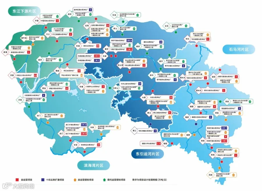 目前,城镇生活污水水质净化项目36个(含代管项目和委托项目),总设计处理规模为250.5万吨/日,占东莞污水处理设计处理规模的54.05%。