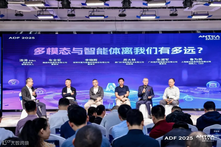 昊辰资本管理合伙人汤涛主持《多模态与智能体离我们有多远?》的圆桌论坛,熵基科技股份有限公司董事长车全宏,深圳市慧为智能科技股份有限公司董事长李晓辉,厦门杉海智能技术有限公司总经理周大林,广州视声智能股份有限公司董事长朱湘军,上海殷泊信息科技有限公司创始人、CEO鲁为民,围绕多模态技术与智能体应用的落地实践、潜在挑战及终端演进趋势展开深入探讨。