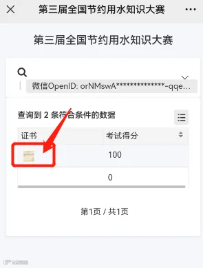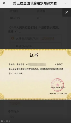 答题完成并以100分通过:点击查看考试成绩→点击100分前面的证书→长按证书保存,如下图中所示