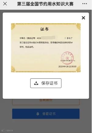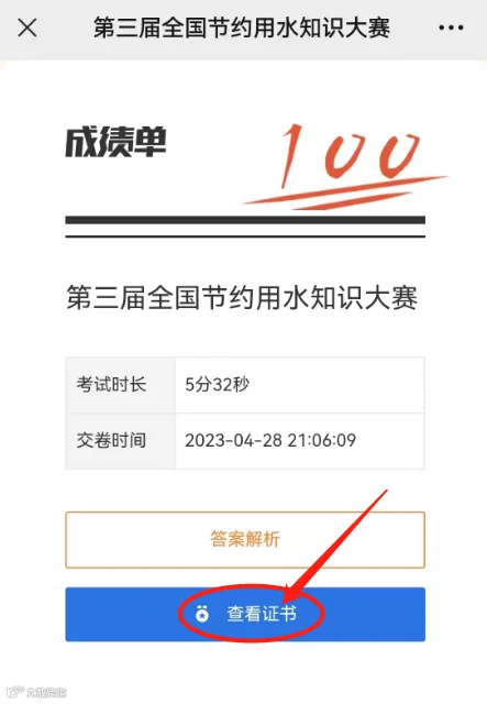 答题完成并以100分通过:点击现金红包(可忽略)→点击查看证书→再长按证书图片保存到手机,如下图中所示