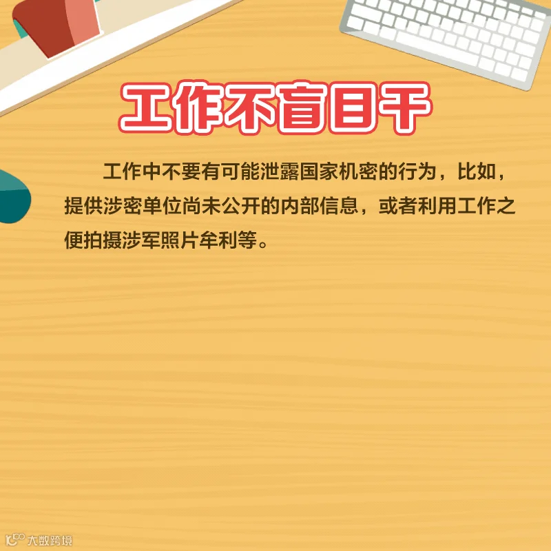 工作不盲目干。工作中不要有可能泄露国家机密的行为,比如,提供涉密单位尚未公开的内部信息,或者利用工作之便拍摄涉军照片牟利等。