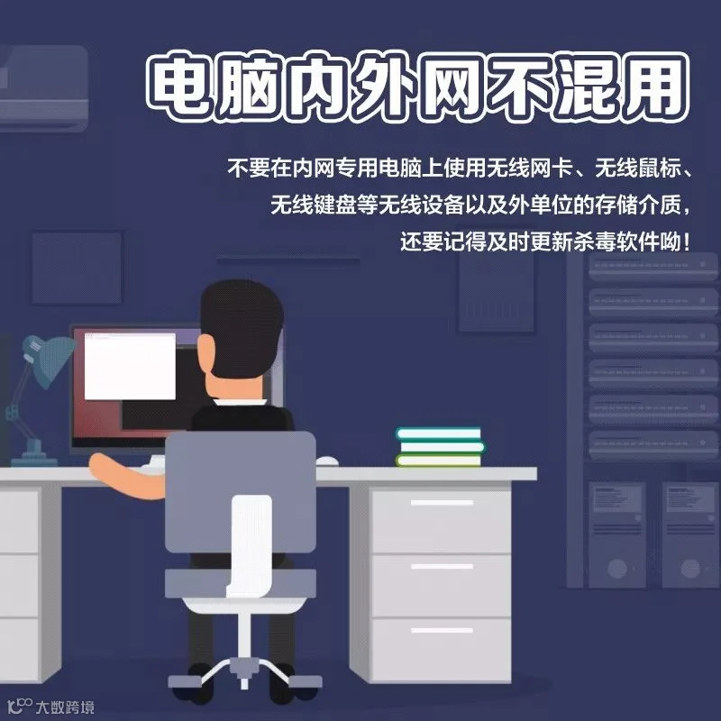 电脑内外网不混用。不要在内网专用电脑上使用无线网卡、无线鼠标、无线键盘等无线设备以及外单位的存储介质,还要记得及时更新杀毒软件呦!