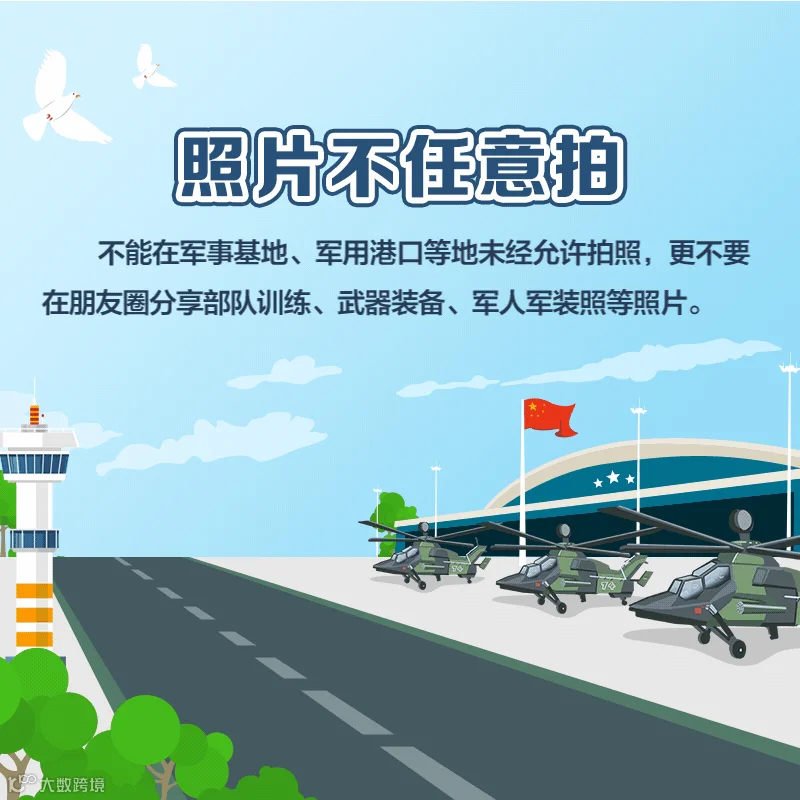 照片不任意拍。不能在军事基地、军用港口等地未经允许拍照,更不要在朋友圈分享部队训练、武器装备、军人军装照等照片。