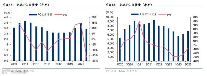 从全球PC出货量的变化看,据IDC数据,从2021年第一季度到2023年第一季度,全球PC市场出货量的同比增速呈现下滑趋势,但最近两个季度全球PC出货量同比增速有所回升。在2020-2021年疫情期间,线上化需求释放是推动PC市场增速的重要因素。技术革新可能会成为推动PC市场成长的重要力量,AI PC通过在本地部署AI能力,有望进一步提升交互体验和工作效率。因此,AI PC有望成为推动PC市场下一波增长的重要力量。