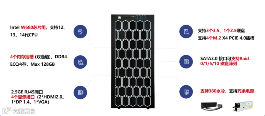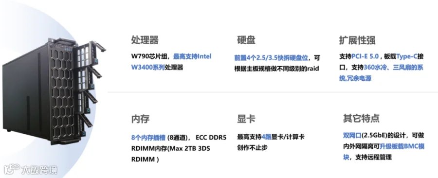 面向需要高性能计算和存储能力的用户,P510采用W790芯片组,最高可搭载Intel W3400系列处理器,拥有强大的数据处理能力,其支持PCI-E 5.0、8通道ECC DDR5 RDIMM内存以及最高4路显卡/计算卡配置,支持冗余电源。此外,P520前置设计的4个2.5/3.5快拆硬盘位,支持塔式/机架式,更是方便用户快速更换或扩展硬盘,还配备了360水冷系统和三风扇系统以及冗余电源设计,确保了长时间工作的稳定性和可靠性。