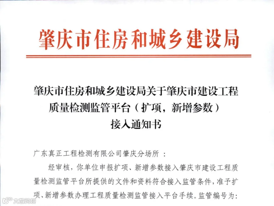 近日,广东真正工程检测有限公司肇庆分场所顺利取得肇庆市住房和城乡建设局核发的肇庆市建设工程质量检测监管平台(扩项,新增参数)接入通知书,正式获批接入市级官方检测监管平台,标志着公司检测资质、技术实力、服务能力再获住建主管部门权威认可,业务布局与合规运营迈上新台阶!