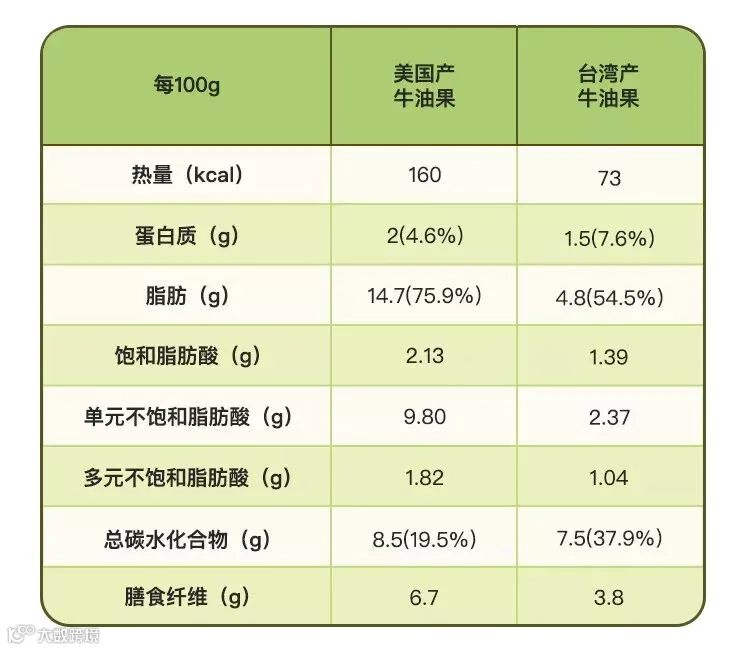产自美国的牛油果中脂肪提供的热量占总热量的75.9%,单元不饱和脂肪酸占比66.7%;而产自台湾的牛油果脂肪提供的热量占总热量的54.5%,其中49.4%为单元不饱和脂肪酸 [1][7]。