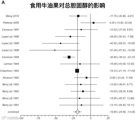 在2015年发表的一项荟萃分析表明,尽管对于高密度脂蛋白胆固醇 (HDL-C) 并无显著影响,但食用牛油果可显著降低健康人群与血脂异常患者的总胆固醇 (TC)、三酸甘油酯 (TG) 以及低密度脂蛋白胆固醇 (LDL-C) (图3)[4]。