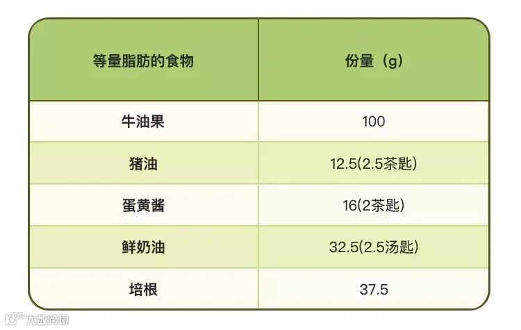 图5:与100g牛油果含有等量脂肪的食物