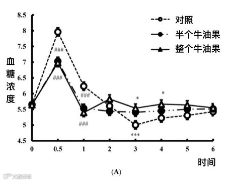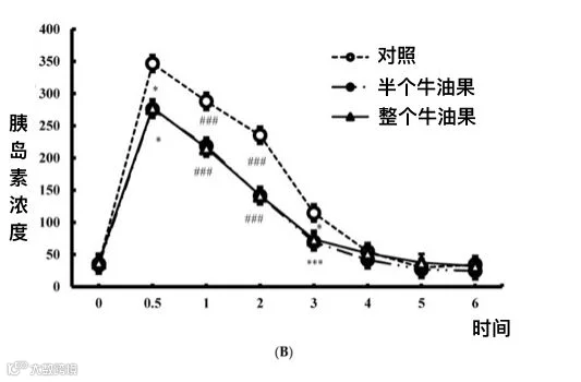 美国一项随机对照实验表明,在饮食中摄入牛油果,可以降低餐后血糖与胰岛素的水平 (图2)[3]。