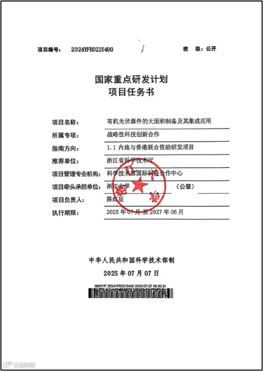2025年7月,由建智集团已投企业追光科技、浙江大学、香港城市大学共同承担的国家重点研发计划“战略性科技创新合作”重点专项——《有机光伏器件的大面积制备及其集成应用》项目正式获批立项。