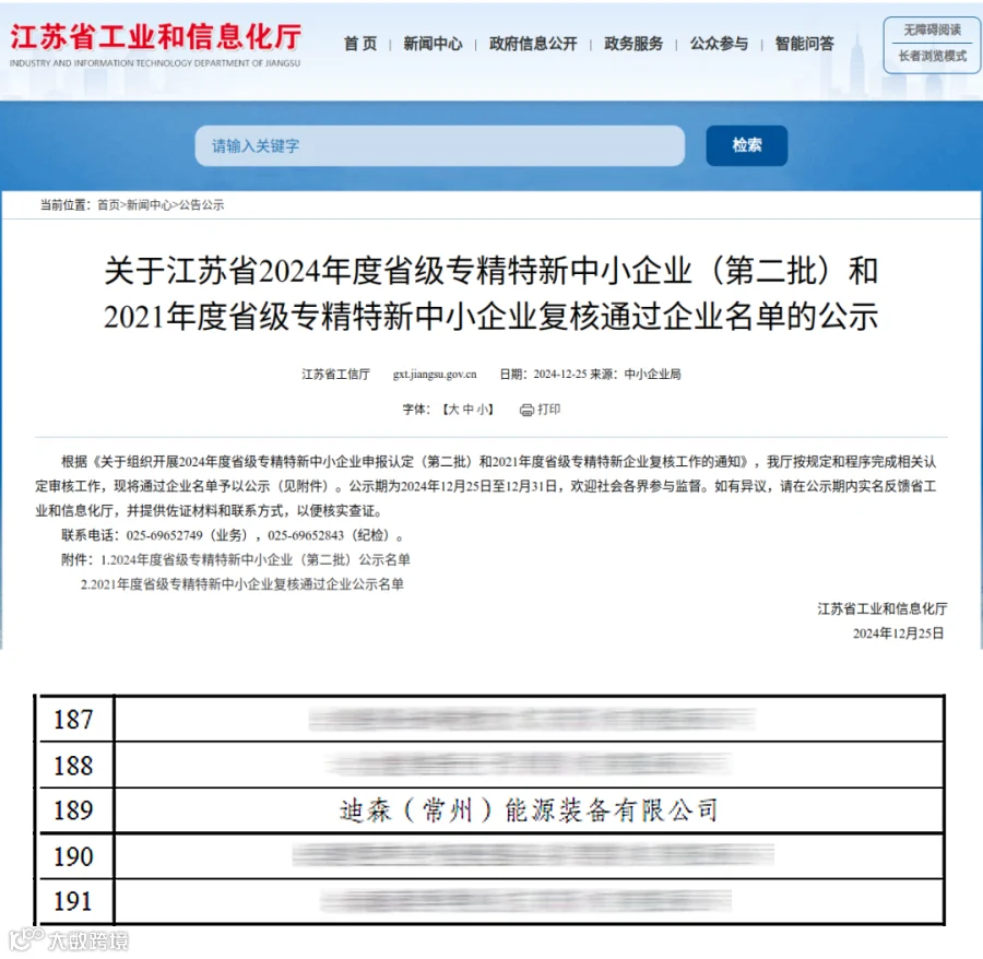 近日,江苏省工信厅组织开展了2024年度省级专精特新中小企业(第二批)申报认定工作,迪森装备公司凭借在产品研发、技术创新以及业务发展等方面的突出成绩,成功入选江苏省专精特新中小企业。这是对迪森装备的充分肯定,也是对公司未来发展的鞭策和激励。