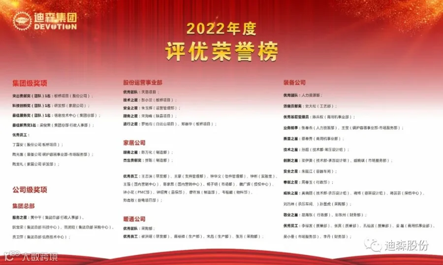 迪森股份子公司众多,集团级的奖项,就显得尤为重量级,经过部门推荐、评优委员会评审,耀眼之星闪亮登场。此处应有热烈掌声!