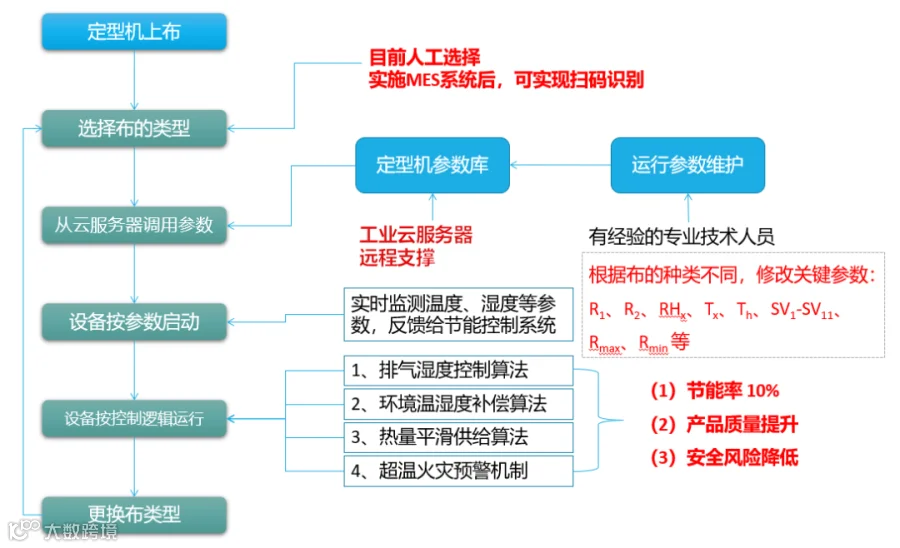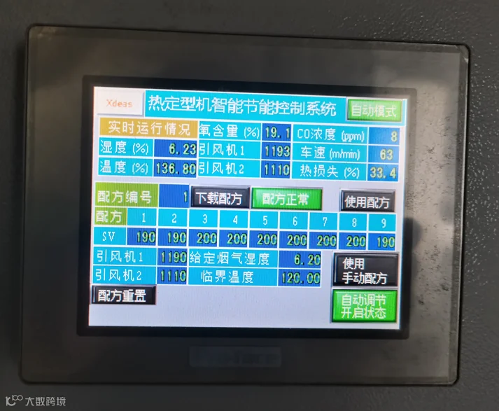 通过监测定型机烘箱及排气的温度、湿度、环境温度、湿度,布匹种类和车速等数据,调节热量、车速、排风机频率、燃烧配风等各运行参数,达到自动、精准、节能调节设备运行,实现能源节约、费用节省的目的。