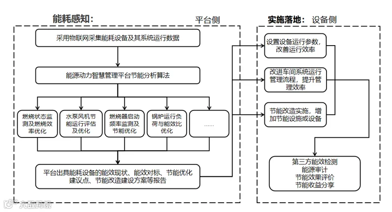 “能源动力管理平台+数字化节能” 产品形态应运而生,其实现路径简单来说分为两部分:能耗感知+节能实施,如下图:
