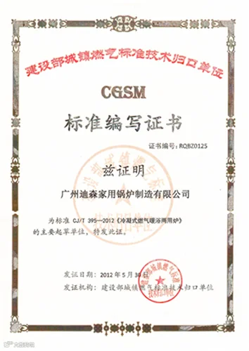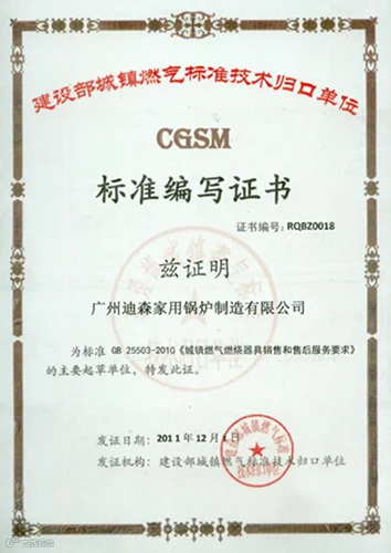 迪森家居作为壁挂炉行业的领先企业,积极参与国家、行业和联盟标准的编制和修订,共参与制定国家、行业和团体标准32项,迪森家居先后主导起草了CJ/T228-2006《燃气采暖热水炉》、强制性国家标准GB25034-2010《燃气采暖热水炉》和CJ/T395-2012《冷凝式燃气暖浴两用炉》等标准。