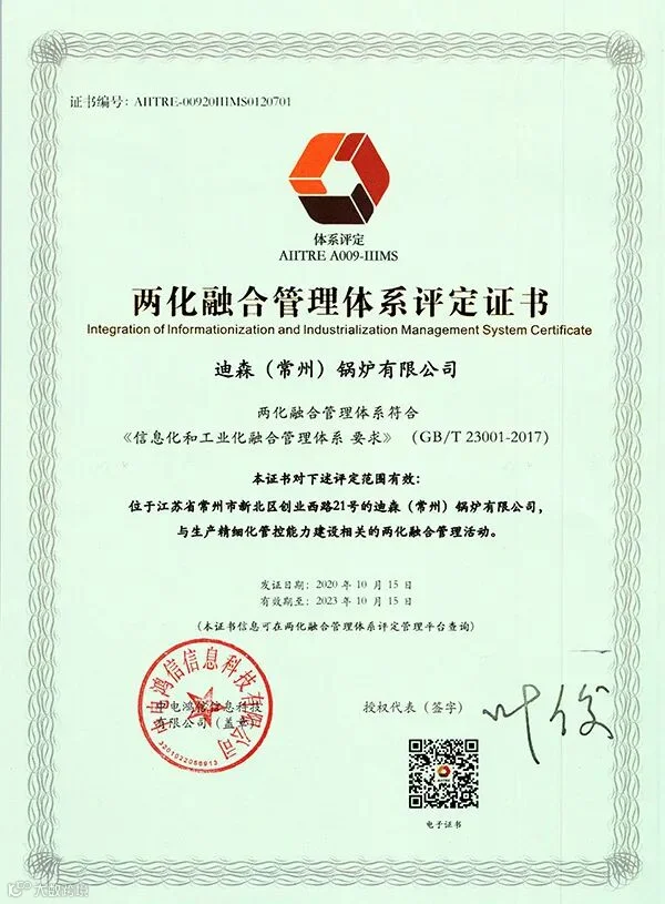 导读:10月29日,从两化融合管理体系评定管理平台获悉,经过15个工作日的公示,迪森(常州)锅炉有限公司正式通过两化融合管理体系贯标认证,并获得了证书。