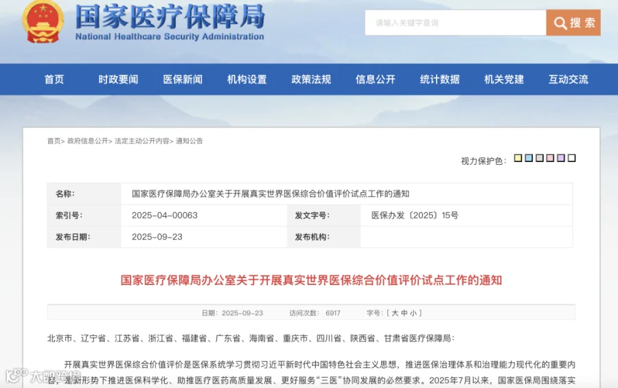 2025年9月23日,国家医疗保障局发布《关于开展真实世界医保综合价值评价试点工作的通知》,决定在北京市、辽宁省、江苏省、浙江省、福建省、广东省、海南省等11个省市的14个先行地区开展真实世界医保综合价值评价试点工作,这一政策将深刻影响药品和耗材企业的医保准入和市场布局,标志着中国医药行业正式进入“真实世界证据”时代。