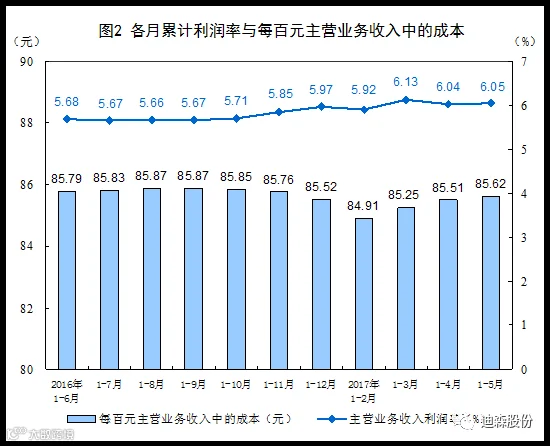 1-5月份,规模以上工业企业实现主营业务收入48万亿元,同比增长13.5%;发生主营业务成本41.1万亿元,增长13.4%;主营业务收入利润率为6.05%,同比提高0.45个百分点。