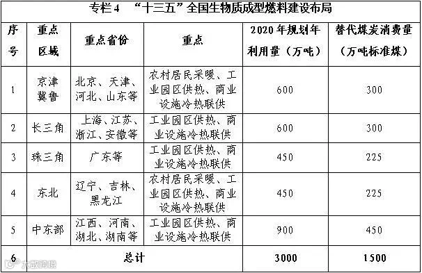 政策摘要:“十三五”生物质能发展目标:到2020年,生物质成型燃料年利用量3000万吨。规划指出,积极推动生物质成型燃料在商业设施与居民采暖中的应用,结合当地关停燃煤锅炉进程,发挥生物质成型燃料锅炉在城镇商业设施及公共设施中的应用。在具备资源和市场条件的地区,特别是在大气污染形势严峻、淘汰燃煤锅炉任务较重的京津冀鲁、长三角、珠三角、东北等区域,以及散煤消费较多的农村地区,加快推广生物质成型燃料锅炉供热,为村镇、工业园区及公共和商业设施提供可再生清洁热力。