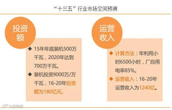 对应行业市场空间的预测,我们从投资额和运营收入来分析。 投资额: 2015 年底农林生物质发电总装机约为 500 万千瓦, 2020 年要达到 700 万千瓦,按照单位装机投资 9000 万/万千瓦,“十三五”期间年投资额为 180 亿。 运营收入: 按照生物质发电厂年利用小时 6500小时(长青生物质发电项目优质,发电小时数达 8000 小时),厂自用电率 15%,售电单价为 0.75 元/千瓦时计算,“十三五”期间运营收入为 1240 亿。 因此, 我们预测“十三五”期间整个行业市场空间将超过 1400 亿。
