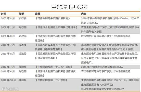 2007-2015 年国家出台相关政策扶持农林生物质能源的发展, 国家对行业的扶持主要从三个方面: 税收优惠, 农林生物质发电享受占比收入 10%的所得税免除和增值税即征即退的优惠; 电价补贴, 农林生物质享受 0.75 元/度的发电收入,高出火电约 0.4 元/度; 竞争性保护, 政策规定在粮食主产区,每个县或者 100 公里内不得重复建设生物质发电厂。
